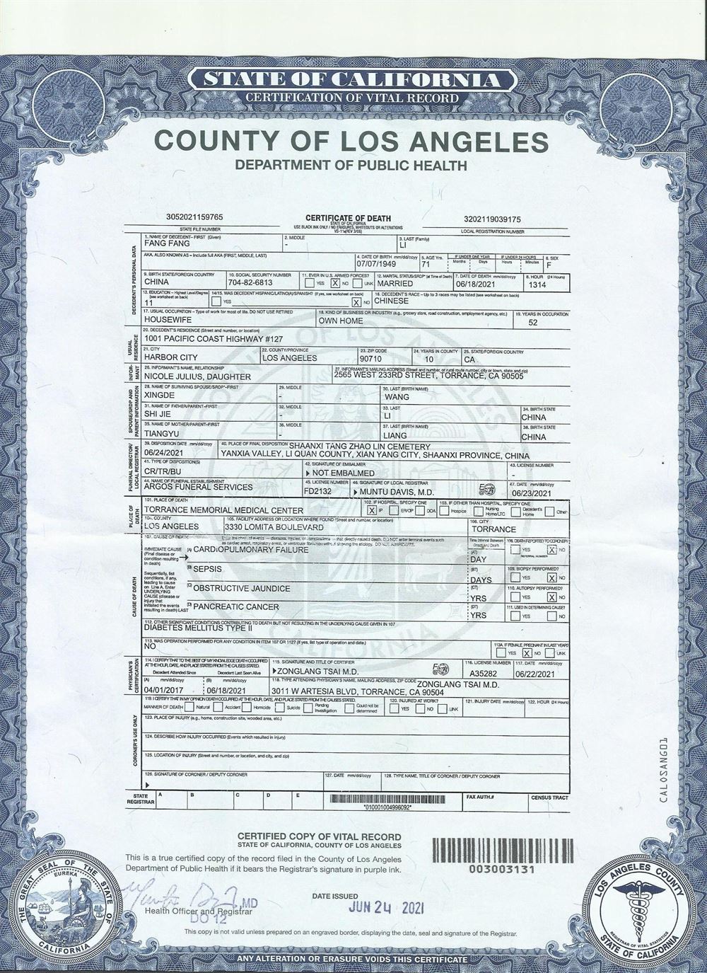咸阳证件翻译盖章 成绩单翻译 户口薄翻译 驾照翻译 咸阳民政 咸阳火葬 美国加州死亡证明翻译模版