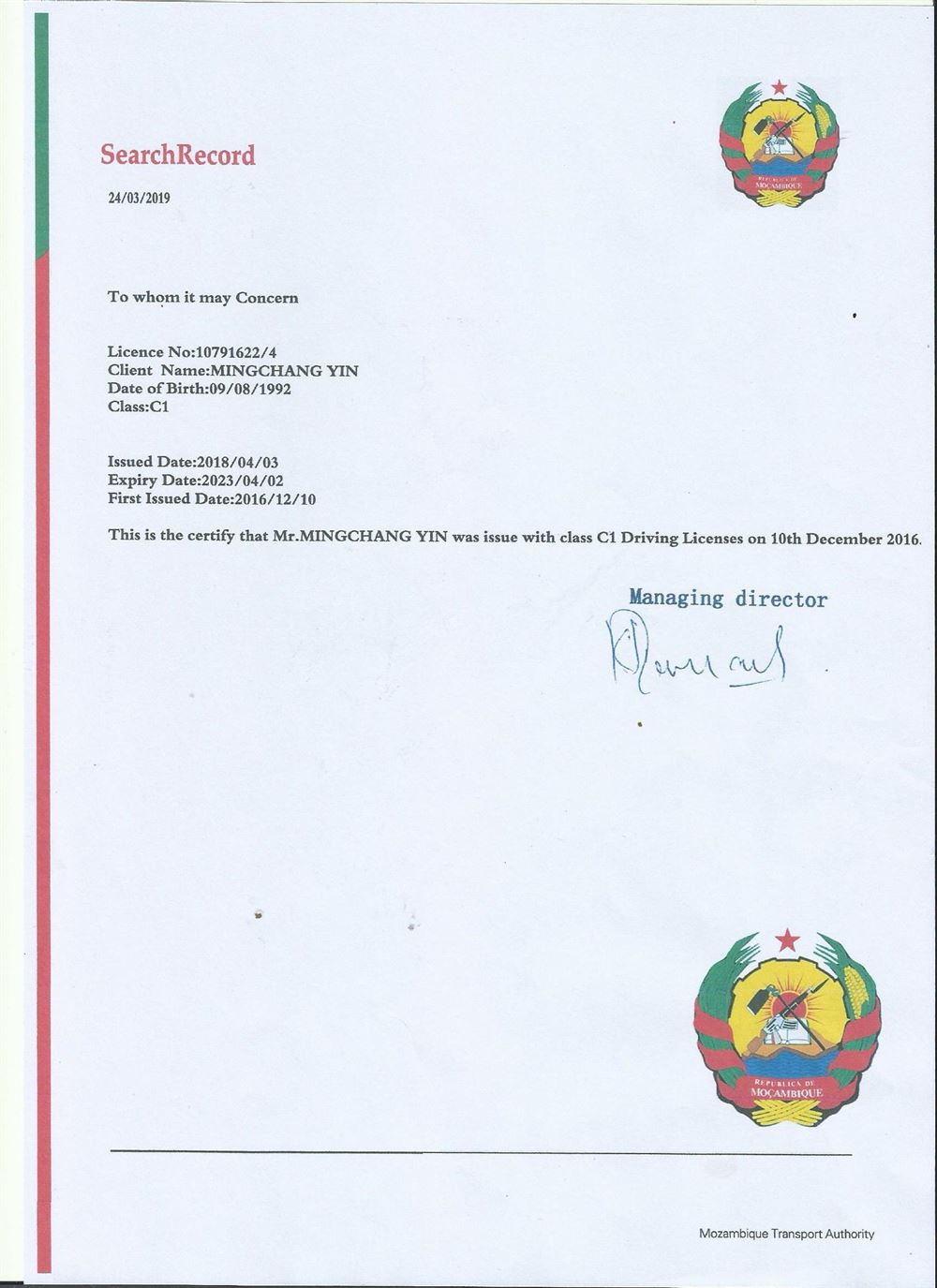 咸阳阿博尔翻译公司 您身边的翻译 咸阳市区随到随译 咸阳车管所认可 莫桑比克驾照证明翻译模版